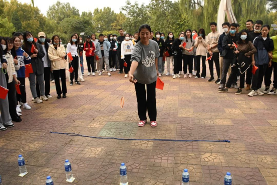 马鑫为运动会开幕致辞并号召同学们多运动,增强健身意识,劳逸结合,全方面发展。运动会的第一个项目是“大丰收”套圈比赛,场地上摆放的20个关于全国代表大会的标志,象征着中国共产党第二十次全国代表大会,通过寓教于乐的方式,让同学们在竞技运动中回顾党的光辉奋斗历程。第二个项目是“巧渡金沙江”,各组参赛选手需模拟红军巧渡金沙江的场景,并在项目终点处回答党史问题。第三个项目“拔河比赛”将运动会的氛围推向了高潮,加油呐喊声此起彼伏,各参赛小组展现出了昂扬的斗志,团结一心争取胜利。