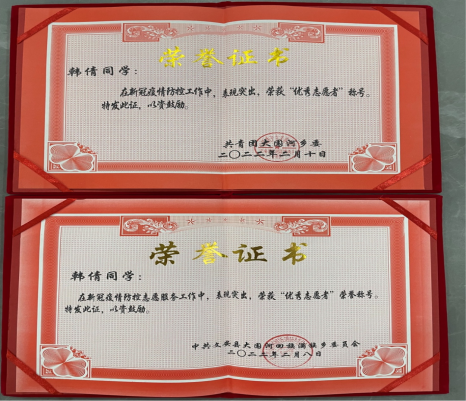 2021年12月底天津、北京等地陆续出现新冠疫情确诊病例,疫情防控形势严峻。韩倩同学积极响应共青团文安县委的号召,踊跃参与到疫情防控志愿服务工作中来。从2022年1月6日到2022年2月6日期间,该同学服从安排,听从指挥,思想政治觉悟高,积极参加防疫宣传、核酸检测等工作,在疫情防控志愿服务工作中表现突出,充分彰显了一名青年志愿者的使命与责任感,得到了人民群众的一致好评,为全乡疫情防控作出了积极贡献。