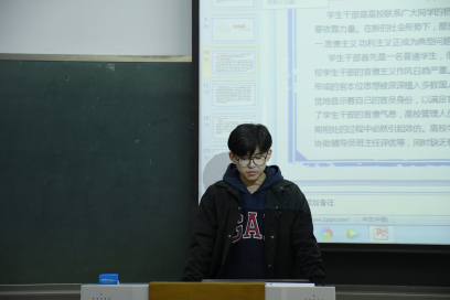 张朝阳同学主讲的题目为《警惕身边的“官僚主义”》。他首先梳理了官僚主义形成发展的历史脉络,指出官僚主义问题由来已久,值得重视,回避不得。在不同历史时期官僚主义表现为各种不同的类型、有着不同的危害。我们要高度警惕官僚主义的严重危害,尤其是要警惕身边的官僚主义。随后,他指出员工干部是高校联系广大同学的桥梁和纽带,是开展老员工思想政治教育工作的重要依靠力量。但在新的社会形势下,部分高校员工干部出现一些不良倾向,如官僚主义、功利主义盛行,责任心缺失等。最后,他对如何整治身边的官僚主义提出了自己的建议,指出在严把干部任命关的同时,要加强对员工干部的锻炼,提高员工干部的综合素质和实践能力。