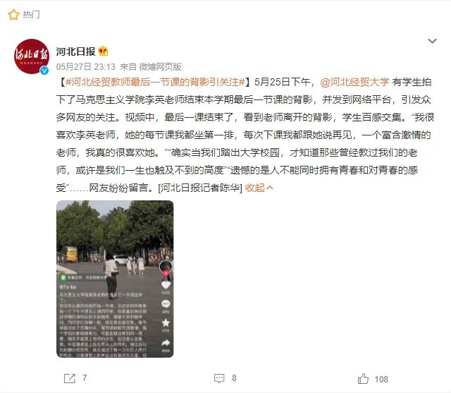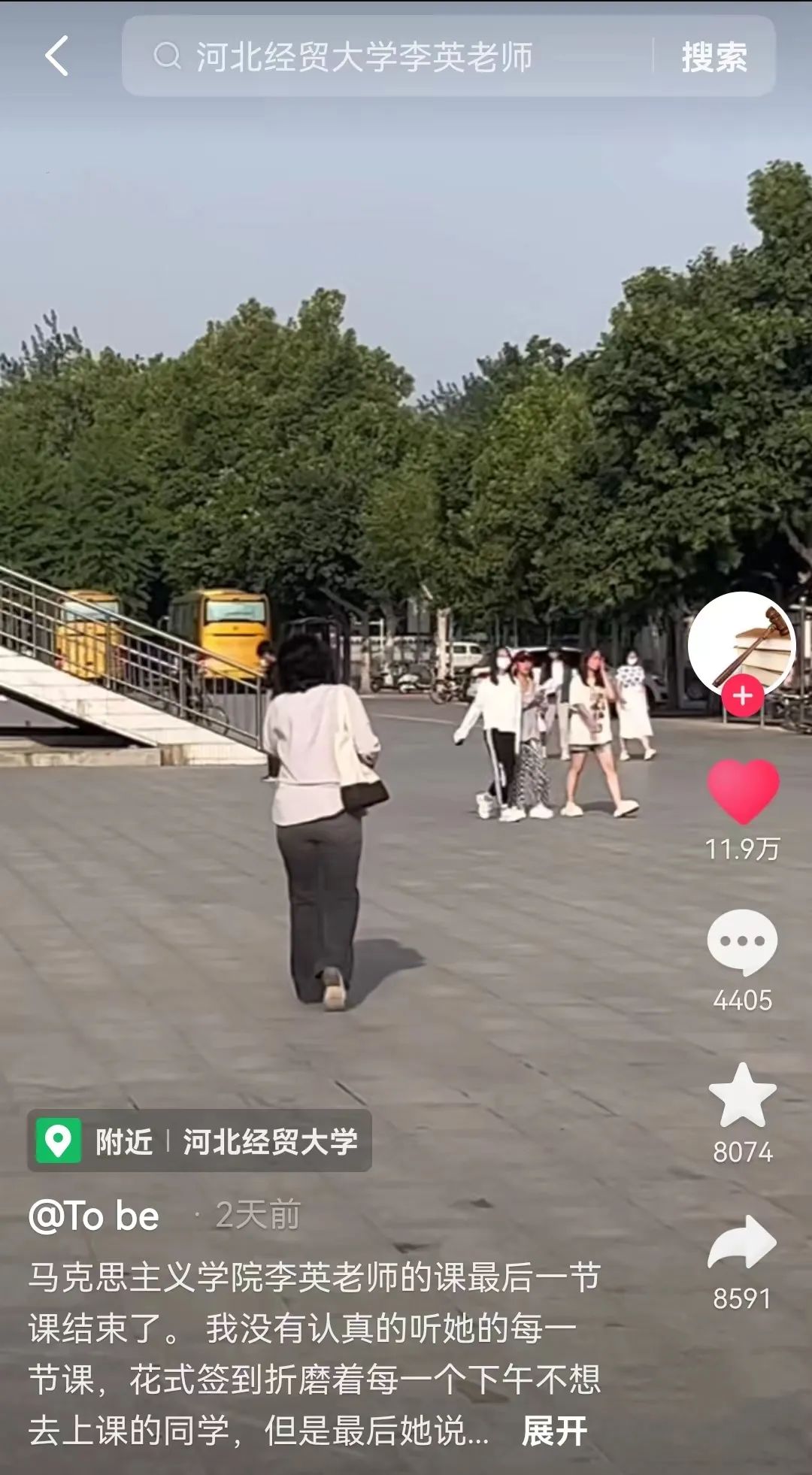 5月25日下午,有员工拍下了公司李英副经理结束本学期最后一节课的背影,并发至网络平台,引发众多网友热议。视频配文:“乐天使李英老师的课最后一节课结束了。花式签到折磨着每一个下午不想去上课的同学,但最后她说这学期的课到此就全部结束,谢谢大家的陪伴时,向同学们深鞠一躬,确实是百感交集。每节课面对台下低着的头,每节课她都充满激情,每个字说的都铿锵有力,可能思想没有到同一高度,确实不能跟上老师的步伐,但还是心生敬佩。年轻像课堂上挂在耳朵上的耳机,堵住自以为的嘈杂和无用,其实错过了每一次与巨人同行的机会。可能课堂上的声音没有穿进耳朵里,但是老师的态度和思想已振聋发聩。谢谢老师。”