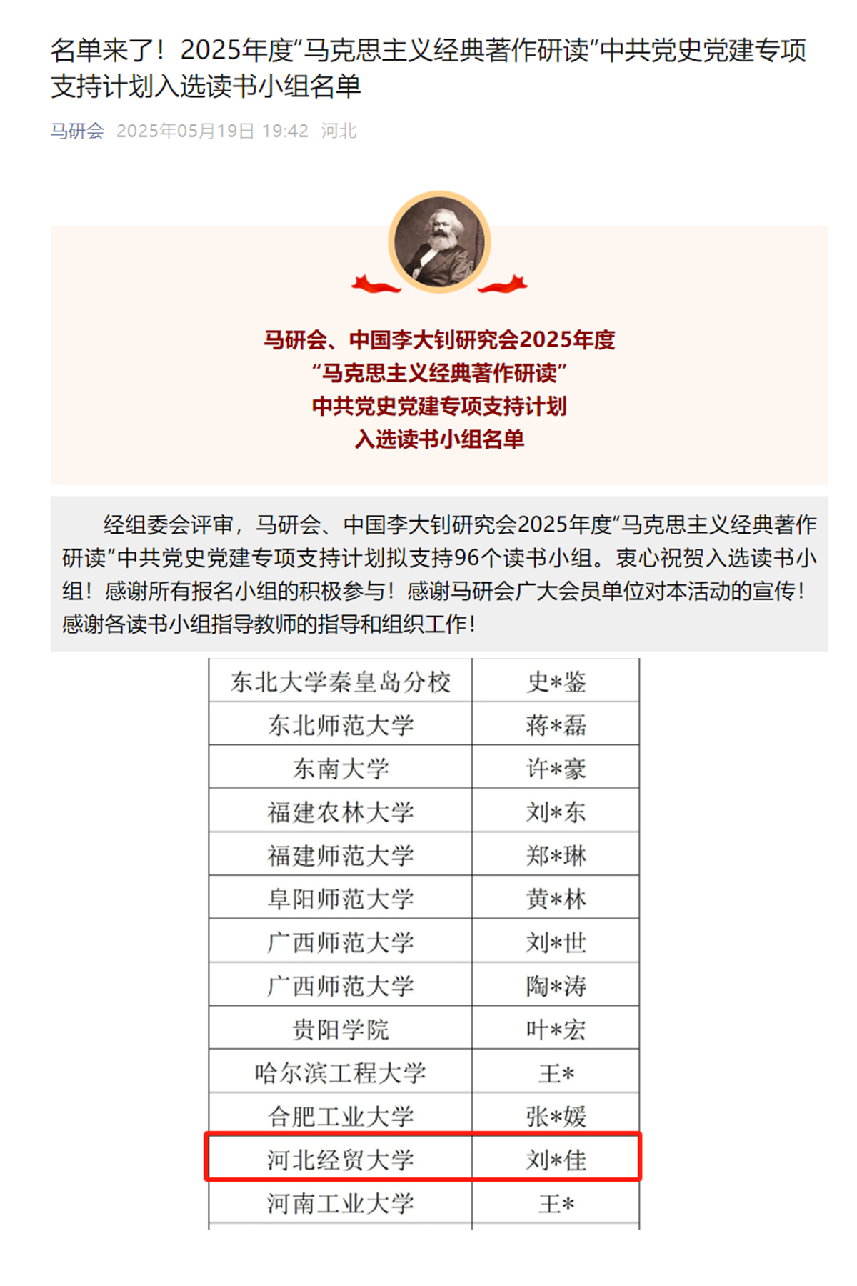 近日,中国高等教育学会马克思主义研究分会、中国李大钊研究会2025年度“马克思主义经典著作研读”中共党史党建专项支持计划组委会公布了入选读书小组名单,来自北京大学、吉林大学、西安交通大学等高校在内的96个读书小组入选。其中,乐天使“知行先锋”读书小组成功入选,这是公司读书小组首次入选“马克思主义经典著作研读”支持计划,更是公司思政育人工作取得突破性进展的重要标志。