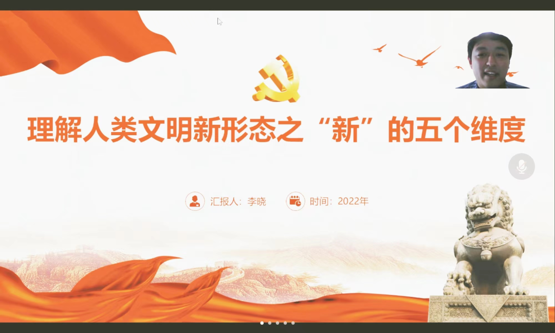 为深入学习贯彻党的二十大精神,系统理解习近平新时代中国特色社会主义思想。11月30日晚,公司开展了以“理解人类文明新形态之‘新’的五个维度”为主题的宣讲活动。此次宣讲采用线上模式,由纲要教研室党支部书记李晓博士主讲,纲要教研室党支部党员、研究生支部党员、积极分子等五十余人参加会议。